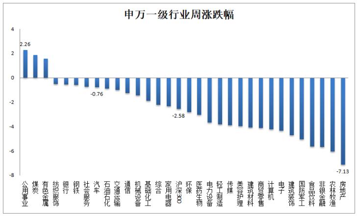 上周市场总体呈小幅下跌走势。从行业表现看,仅有公用事业(+2.26%)、煤炭(+1.86%)和有色金属(+1.56%)录得正收益。跌幅靠前的行业分别是:房地产(-7.13%)、农业(-6.05%)、非银(-5.70%)、食品饮料(-5.66%)和军工(-5.05%)。